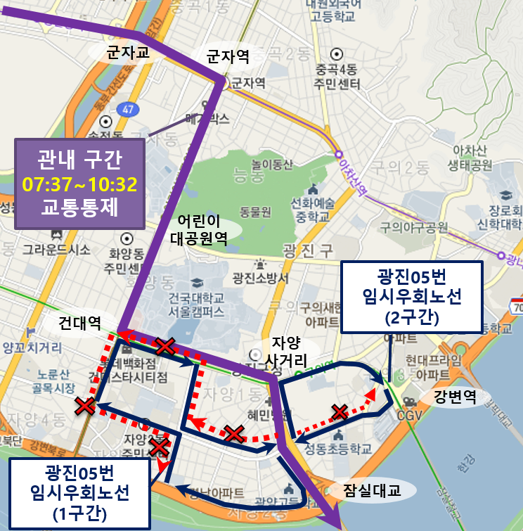 - ■ 우회구간 : (1구간) 신자초교⇒건대역⇒송림식당⇒신자초교 교차로⇒잠실대교북단교차로⇒자양강변길⇒신자초