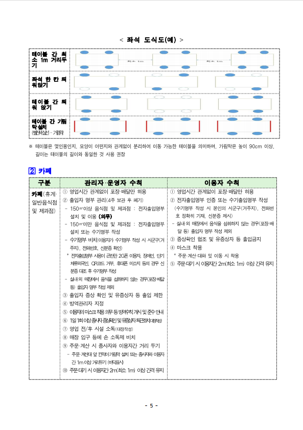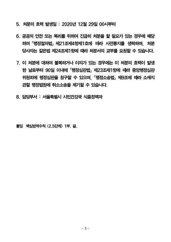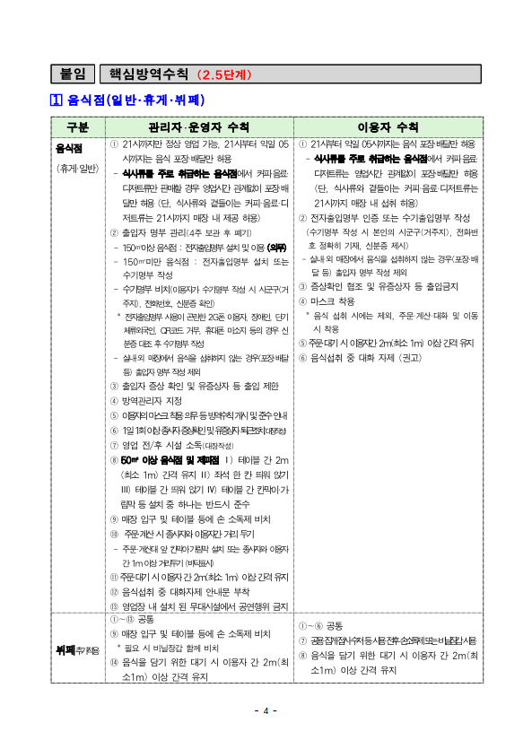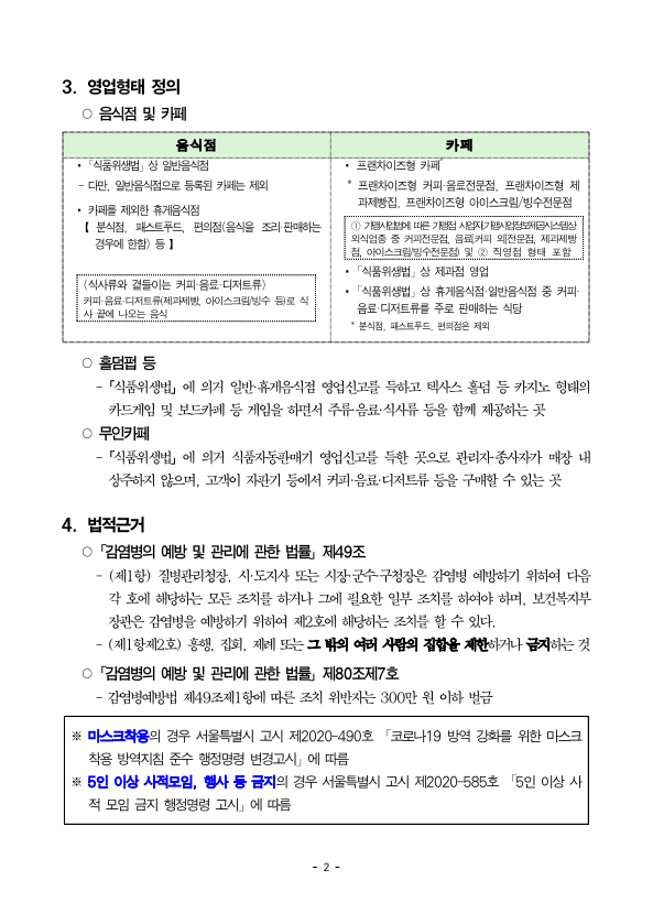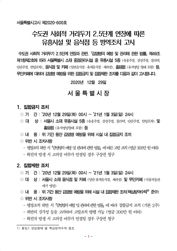 수도권 사회적 거리두기 연장(2.5단계)에 따른 유흥시설 및 음식점 등 방역조치 고시
