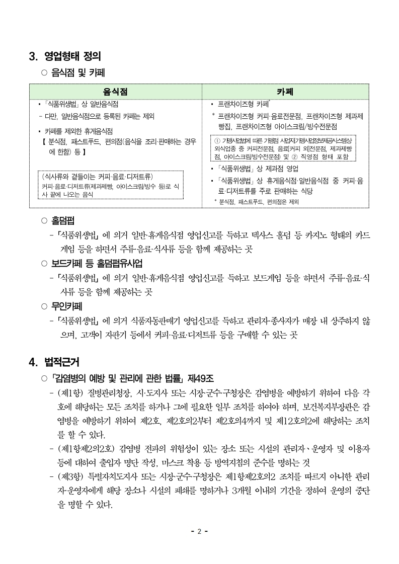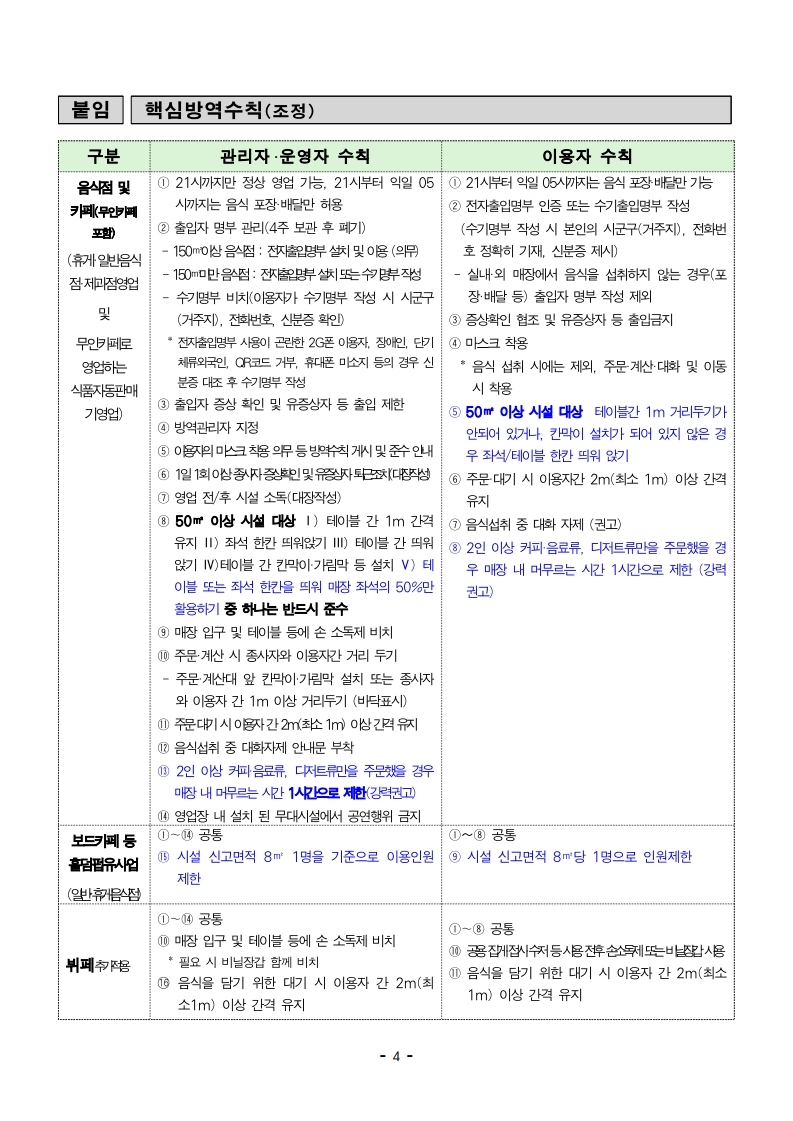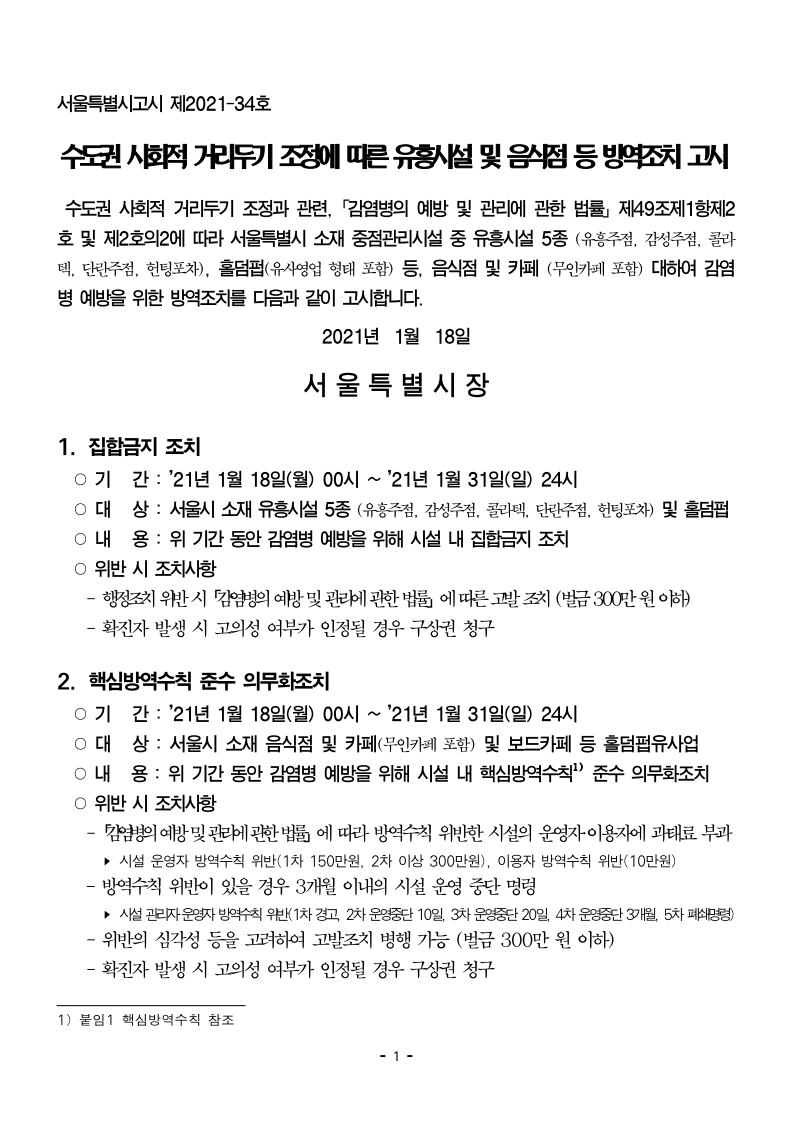 수도권 사회적 거리두기 조정에 따른 유흥시설 및 음식점 등 방역조치 고시('21.1.18)