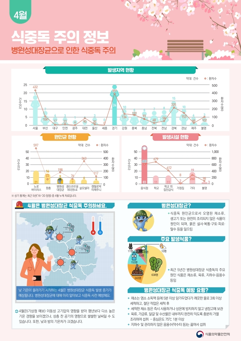 ○ 식품의약품안전처에서 최근 5년간(2016년~2020년) 4월의 식중독 발생현황 분석결과, 주요 식중독 발생 원인병원체는병원성대장균이며, 음식점과 기숙사 등 단체급식 시설 등에서 발생이 예상되오니, 식중독 예방에 유의하여주시기 바랍니다.