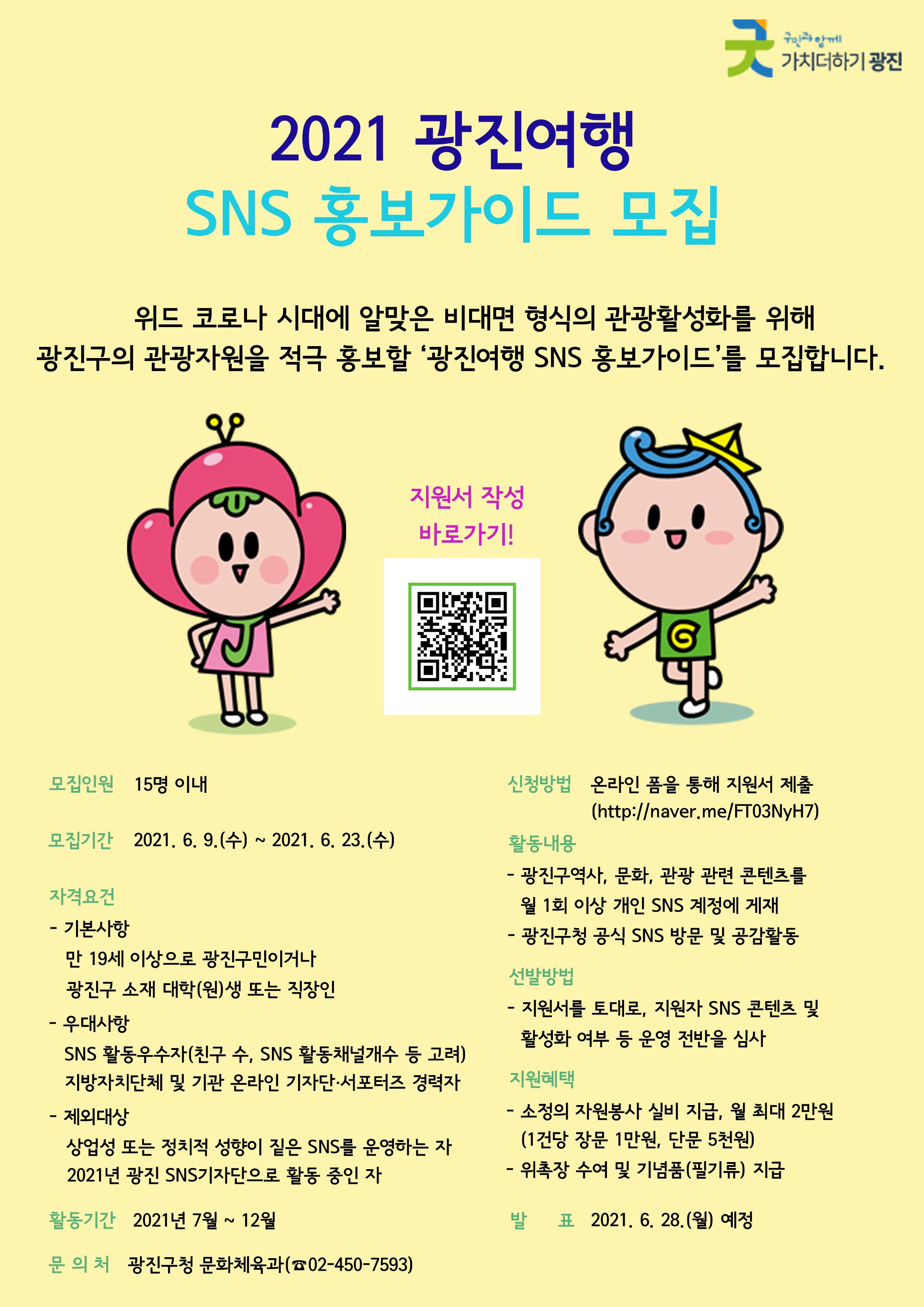광진구에서는 광진구의 역사, 문화, 관광 등에 관심을 갖고 소셜미디어를 통해 광진구의 관광정보를 생생하게 알릴 '2021 광진여행 SNS 홍보가이드'를 모집합니다. 책임감을 가지고 활동해 주실 분들의 많은 관심과 참여를 바랍니다.