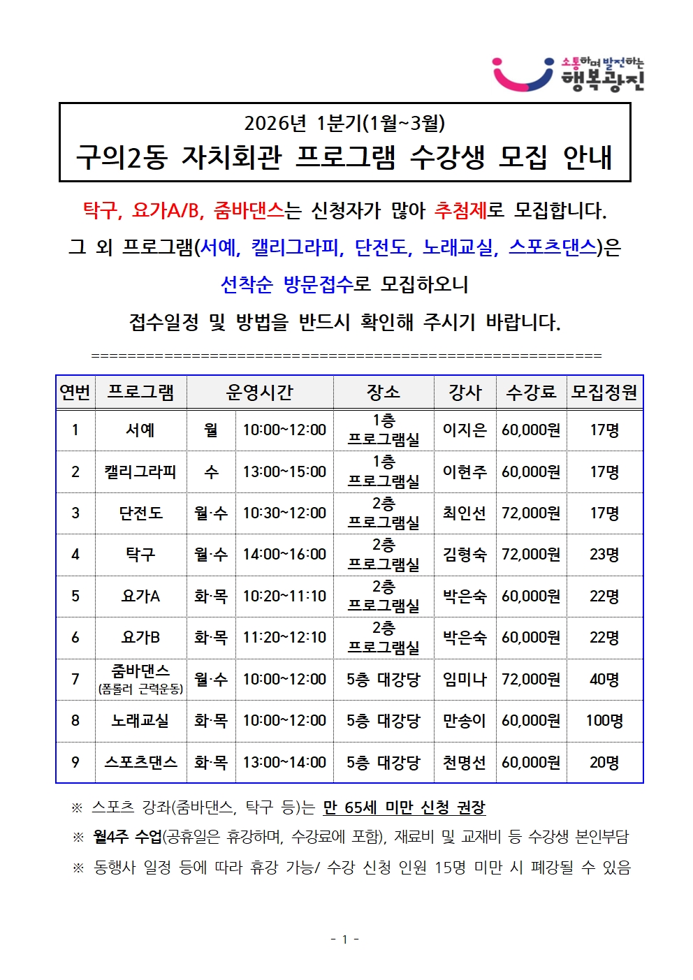 2026년 1분기 구의2동 자치회관 '요가A' 프로그램 수강생 모집